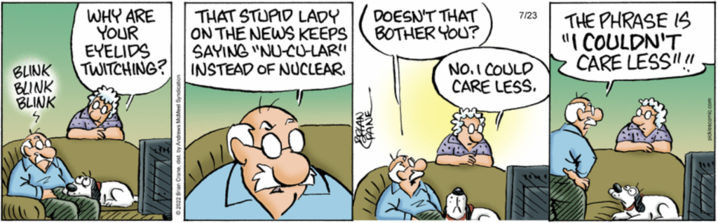 First lesson: The pronunciation of “nuclear” is undergoing linguistic transition. The dictionaries are even giving both pronunciations. A similar duo that I’d be a bit more dogmatic about is calvary and cavalry. You know the difference, right?